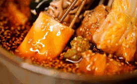 精心熬制四個小時(shí)的紅油,加了各種香料的冰鎮(zhèn)底湯,撒上用油炒的噴香的芝麻,合而為一才是冷鍋串的精髓,串串全部放入大缽缽中,再澆上香氣濃郁的料湯,食材吸收料湯后開始入味,浸泡的時(shí)間越久就越好吃,而最正宗的吃法還要加冰,想想這冰爽。